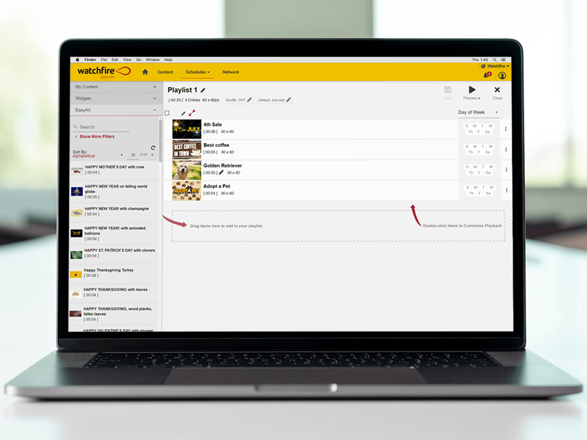 Upload images and videos, and use the versatile content editor to quickly create professional-looking messages. The editor is easy for users at all skill levels. You can experiment with the custom content editor tools and take advantage of Watchfire’s EasyArt library containing over 1000 different animations and still images.